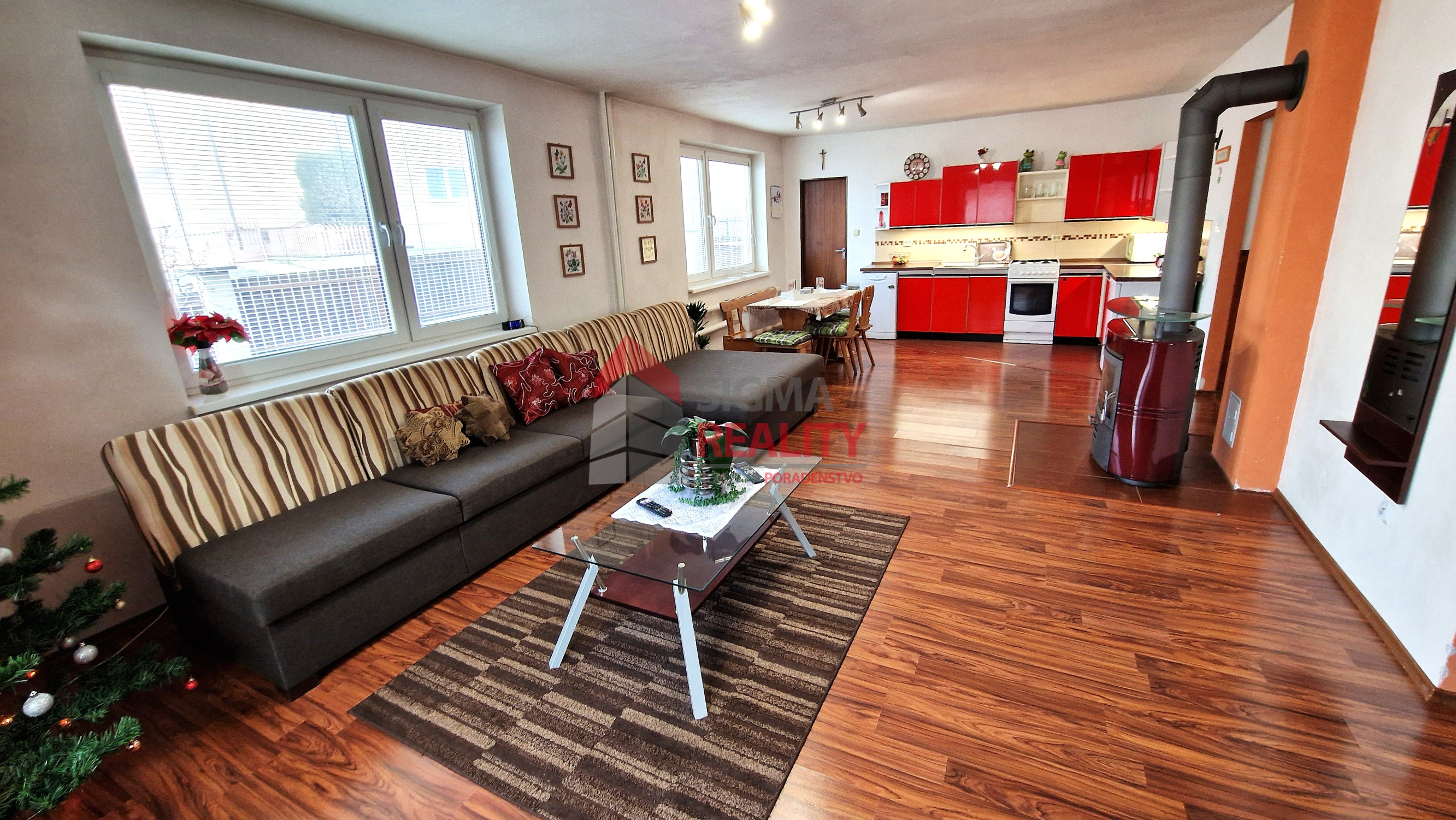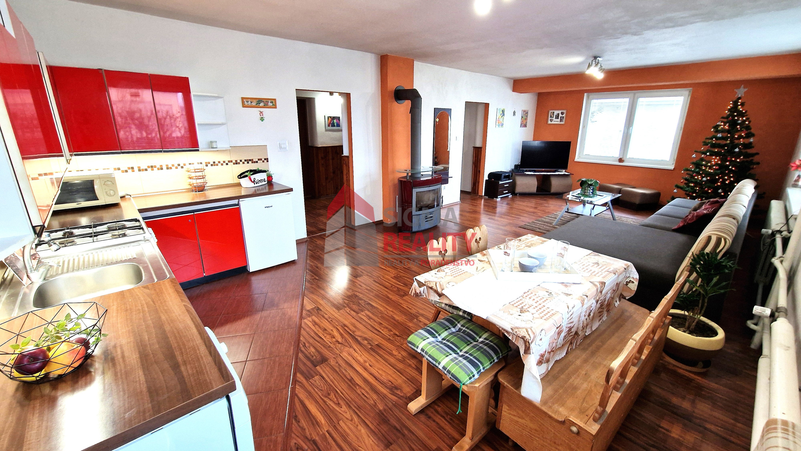 Priestranná kuchyňa prepojená s obývačkou v ktorej sa nachádza krb